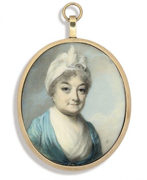 | Lady Clayton, in turquoise dress with white fichu, black choker, white turban in her powdered curling hair; sky background | |