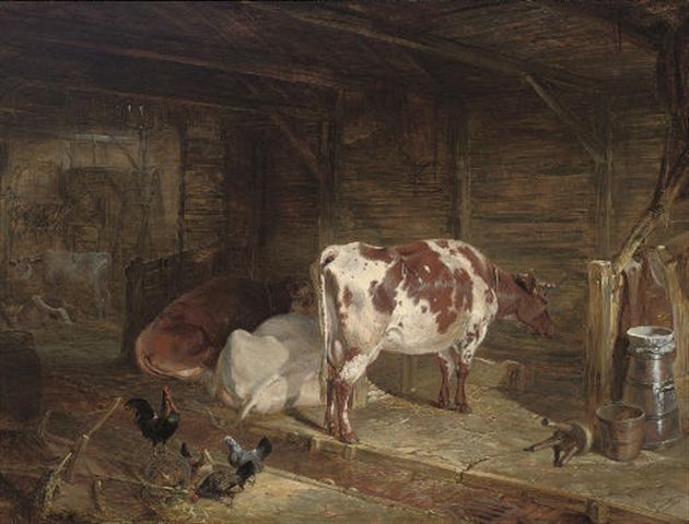 Cattle and chickens in a barn
