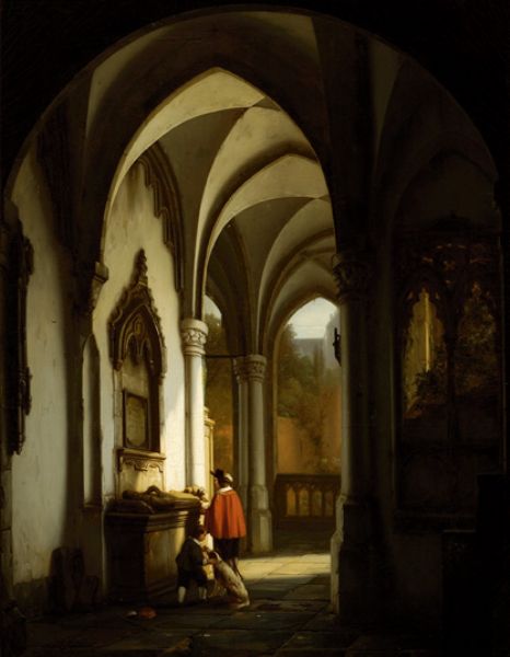 Twee figuren en een hond bij een praalgraf in een kerkportaal