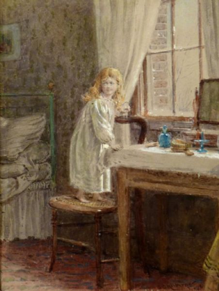 A YOUNG GIRL STANDING ON A CHAIR LOOKING OUT OF A WINDOW