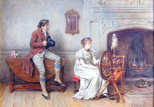 Courtship scene at the spinning wheel