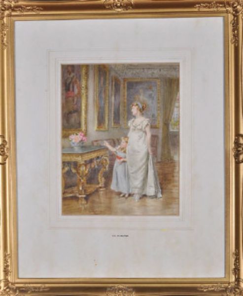 | THE INTERIOR OF A COUNTRY HOUSE WITH A LADY SHOWING A YOUNG DAUGHTER A FAMILY PORTRAIT | |
