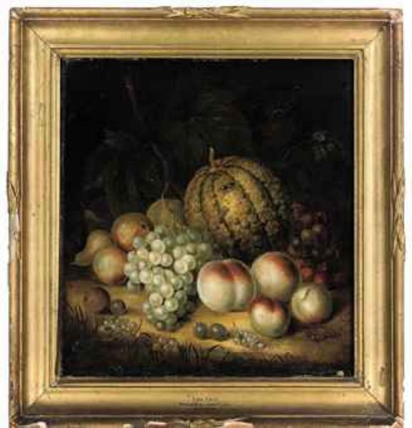 | A pumpkin, apples, grapes, pears, cherries, gooseberries, berries and a plum on a mossy bank | |