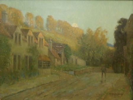 Figure in a Lane by Cottages at Moonlight