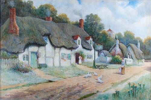 A country village lane with figures and geese outside an inn
