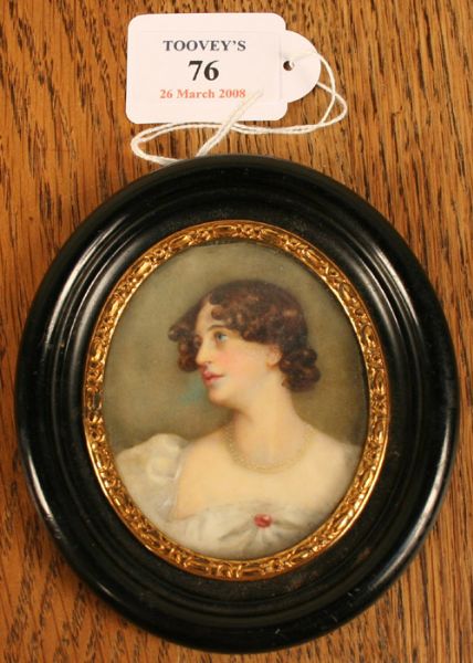 | Oval Miniature Head and Shoulders Portrait of a Lady with Ringlets wearing a White Décolleté Dress | |