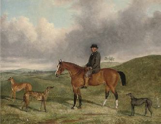 | Portrait of Henry Beale Esq., on a hunter, with his greyhounds, including Sampler and Sapphire, in an extensive landscape | |