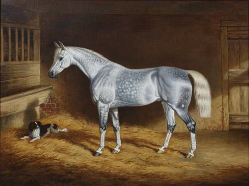 A dappled grey hunter and a spaniel in a stable