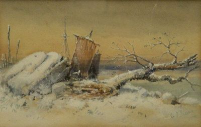 Winter landscape with boats on the water's edge