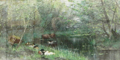 River landscape with ducks on bank