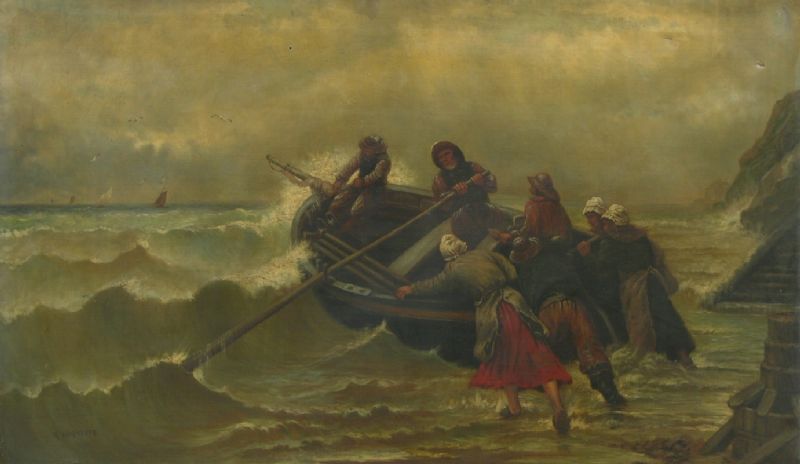 | A copy of a Winslow Homer-like composition depicting fishermen at the shore of a stormy sea | |