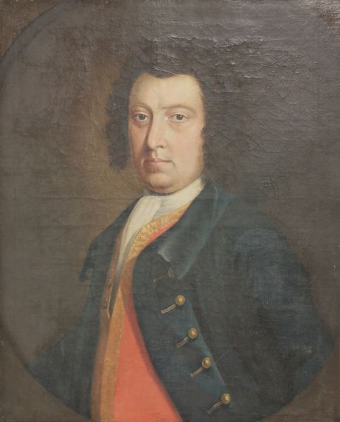 | PORTRAIT OF A GENTLEMAN OF THE DOWNES FAMILY OF POTT SHRIGLEY HALL, CHESHIRE, HALF LENGTH, IN A BLUE COAT AND RED WAISTCOAT | |