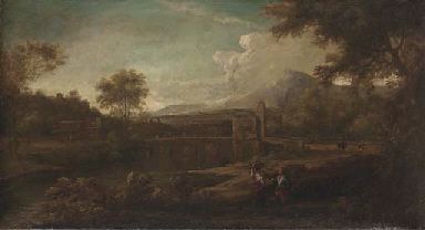 | Italianate river landscape with figures in the foreground, a Roman bridge beyond | |