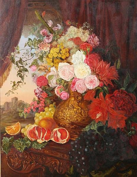 | A still life study of a flower filled neo-classical urn with oranges and grapes beside it's base, standing on a table with drape | |