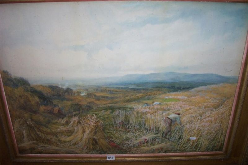 | study of a harvesting scene with farm workers tying corn stooks, with distant panorama including mountains, river, | |