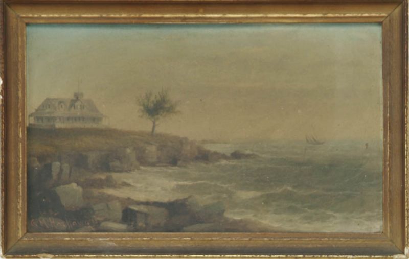 | Oil on board scene shows a rocky point of land with a large cottage. A lone tree is at the end and the house has a wrap around porch. A sailboat is seen off point in choppy ocean | |