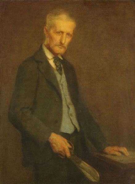 PORTRAIT OF A MAN HOLDING LARGE SHEARS