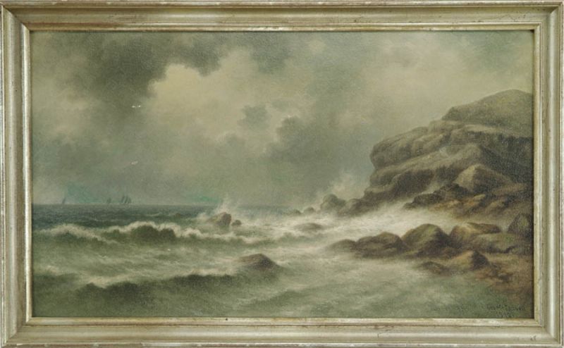 | Oil on board coastal scene shows ships off the rocky coast of Maine in stormy weather | |