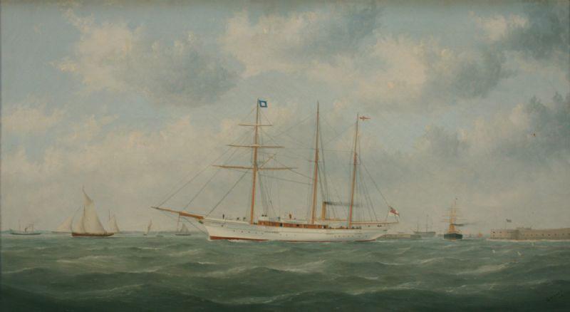 | Study of a Topsail Schooner in Profile on the English Channel, other Sailing Vessels and a Harbour beyond | |
