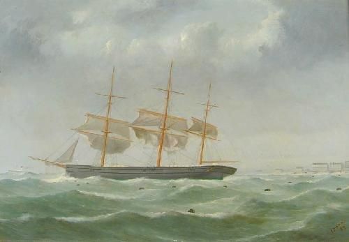| Triple-masted schooner in choppy seas off the south coast, with steamer in the distance | |