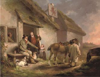 | A game keeper with other figures, dogs and a horse outside the Red Lion inn at sunset | |