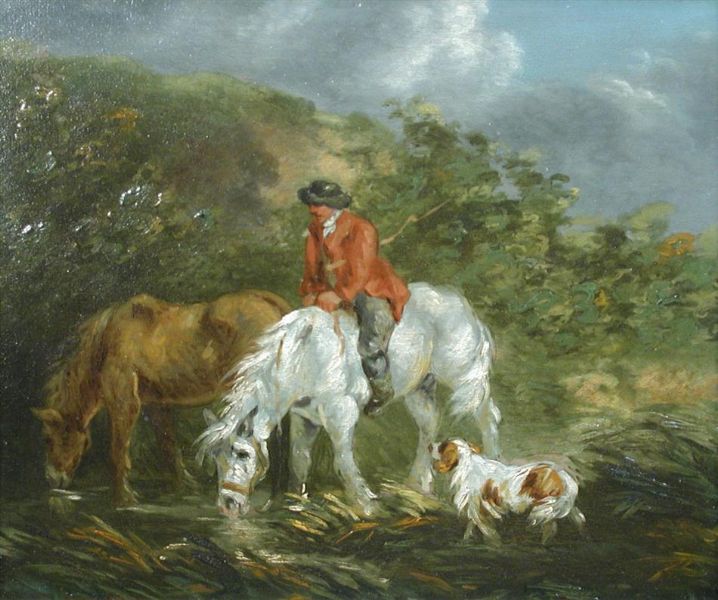 A Rider Watering a Grey Horse, with his Spaniel beside him