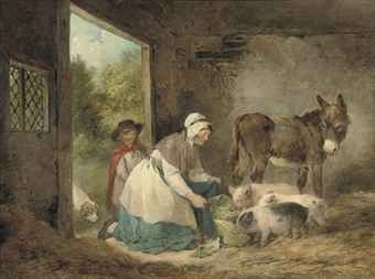 | A woman and child feeding pigs in a stable, with a dog and a donkey | |