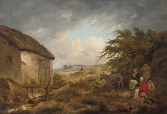 | A wooded landscape with travellers at rest on a track, by a cottage | |