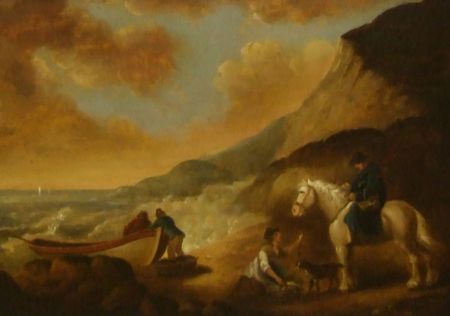 Coastal Scene with Fisherman, Fishing Boat, further Figures and Horse