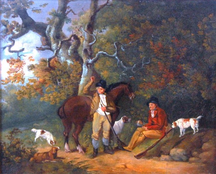 | Huntsmen with horse and hounds resting in a wooded landscape | |