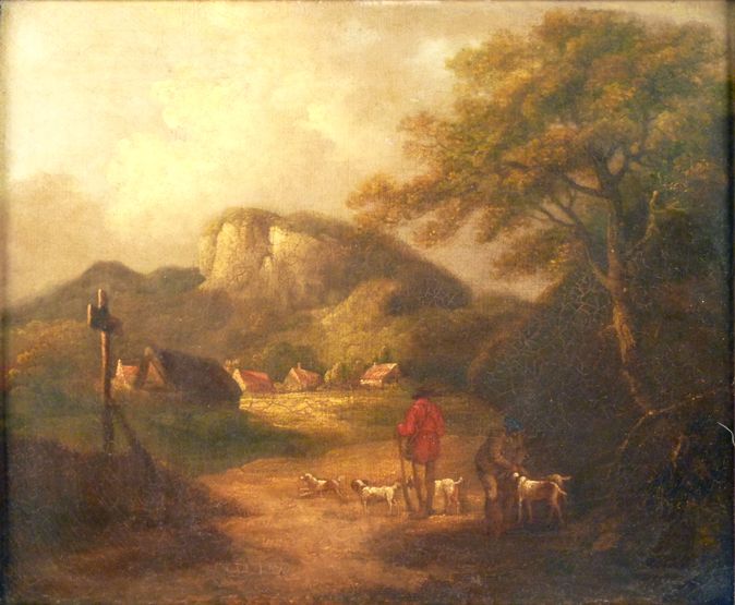 FIGURES WITH DOGS, NEAR A VILLAGE IN A WOODED LANDSCAPE
