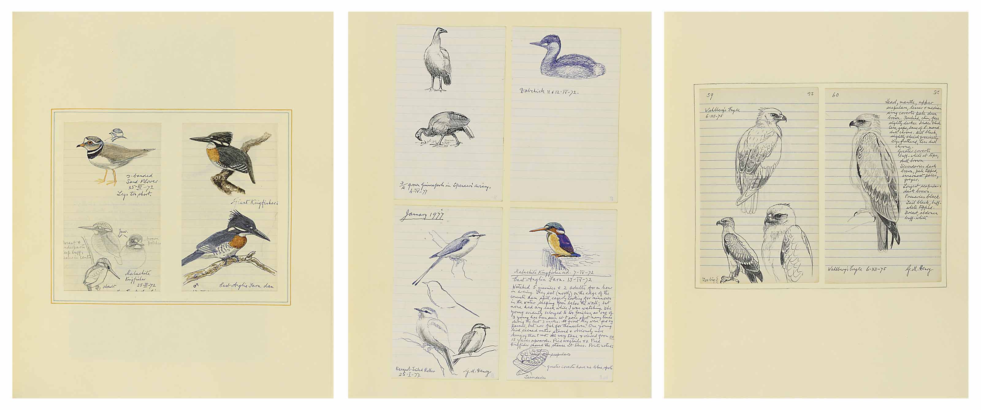 | Pencil biro, pen and ink, many with watercolour, some on lined paper, some on coloured paper | |