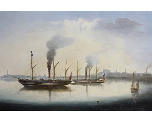 Crowded paddlesteamers lying at anchor in a harbour
