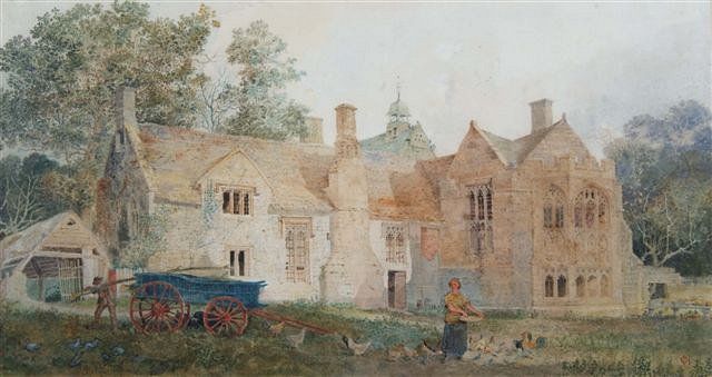 A farm girl feeding the chickens in front of a Gothic style manor house
