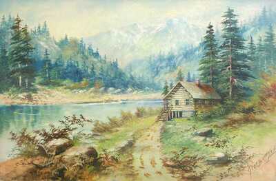 River cabin with mountains in the distance