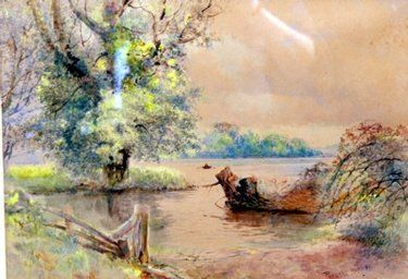 river scene with solitary rowing boat in the distance
