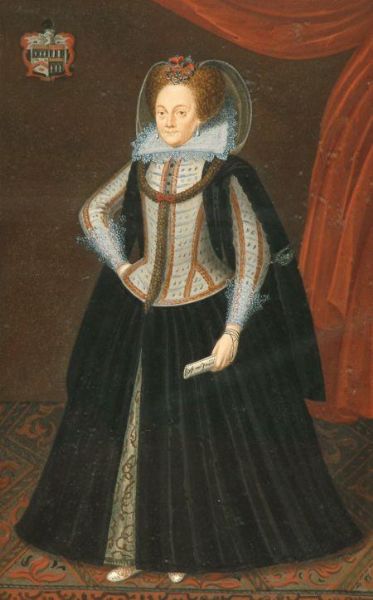 | a full-length standing portrait wearing lace ruff collar embroidered bodice and velvet dress | |