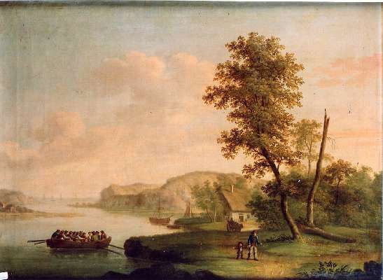 Landschaft mit Häusern an einer Meeresbucht sowie Personen und Booten
