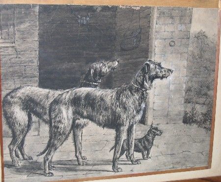 | study of a scottie dog and a pair of lurchers outside a stable | |