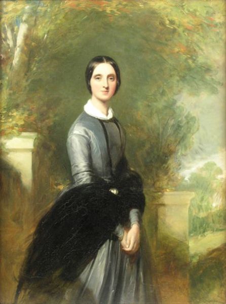 | PORTRAIT OF A YOUNG LADY, THREE-QUARTER LENGTH, IN A GREY DRESS AND BLACK SHAWL IN WOODED PARKLAND | |