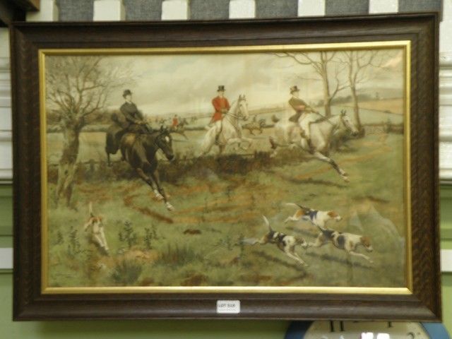 Foxhunting Scene with hounds and the Field jumping a post and rail fence