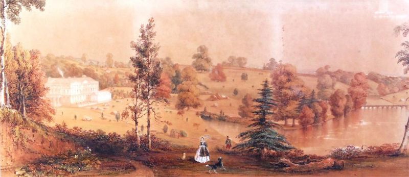 | Figures and dogs in the garden of an extensive English estate | |