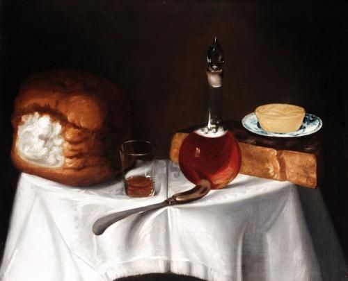 STILL LIFE WITH BREAD, CHEESE AND A DECANTER