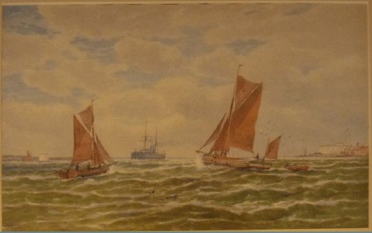 | Fishing boats heading out of harbour mouth with naval warship approaching | |
