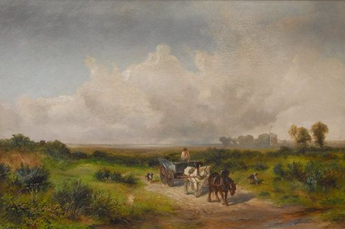 Returning Home, an extensive summer landscape, with horse, cart and sheep dogs
