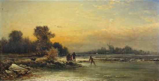 A Fisherman and his Family by a Frozen River, a windmill beyond