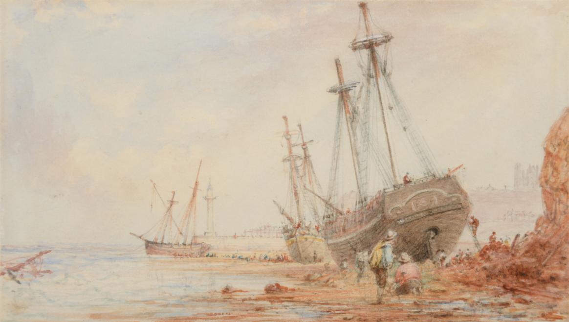 | Beached vessels before Whitby Abbey with various figures at low tide | |