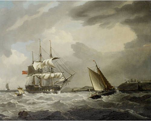 | A '74' of the Royal Navy heaving-to in St. Mawes harbour, with St. Mawes Castle on the headland beyond | |