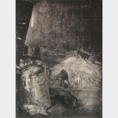 ''Hungry Dogs'' (Mason 1)- lithograph, 1916, signed, titled and numbered 14 in pencil, edition of 41, first state, ink stains in right margin. 13 1/2 x 9 3/4'' | |