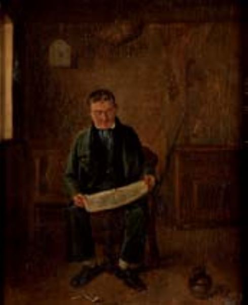 Clerk reading a newspaper in an interior